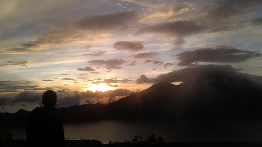 Am 15.02.17 kam ich in Ubud an. Von der Haltestelle des Shuttlebuses musste ich noch ca. 2 km zu meinem Hostel laufen, was aber auch nicht so schlimm war. Dort schaute ich mir den "Monkey-Forest" an und kaufte mir ein neues Paar Schuhe, was ich dringend notwendig hatte. Ich buchte auch eine Sunrise-Trekking-Tour, bei der ich am nächsten Tag zwischen 2 und 2:30 an meinem Hostel abgeholt wurde. Abends war ich mit 2 anderen Deutschen bei einem Italiener essen, wo ich seit langem wieder mal eine gute Pizza bekam. Am nächsten Tag ging dann meine wurde ich dann mitten in der Nacht bei meinem Hostel abgeholt. Nachdem der Bus alle Leute eingesammelt hatte machten wir nach einer halben Stunde Fahrt eine kleine "Frühstückspause", bei der es Pfannkuchen mit Banane und Kaffee gab. Nach einer weiteren Stunde Fahrt erreichten wir den Ausgangspunkte der Wanderung. Von dort aus ging es mit Taschenlampen 1,5 bis 2 Stunden lang auf den Mount Bartur. Anfangs liefen wir voll rein in den Nebel. Es sah so aus als würde man nur Wolken sehen. Kurz vor Sonnenaufgang verbesserte sich die Sicht deutlich, sodass nur noch ein paar kleinere Wolken im Weg waren.