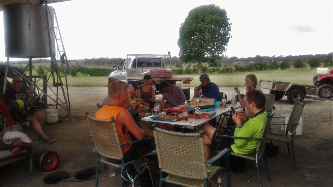 In Childers war ich in der "Childers Eco-Lodge" untergebracht. Vom Hostel aus fuhr ich täglich bei ein paar Anderen zu einer Macadamia Farm mit. Dort pflückten wir aber keine Nüsse, wie ich ursprünglich dachte, sondern entfernten von dem Bäumen Plastikschilde, die mit zwei Metallspießen festgemacht worden waren. Auf dieser Farm arbeitete ich nur eine Woche von Montags bis Freitags. Der Farmer war zwar nett, aber der Job war bei ca. 30 Grad trotzdem anstrengend, vor allem für meine Finger, die bereits nach kurzer Zeit einige Blasen hatten. Am Ende bestellte der Farmer, der aus der Schweiz kam, Pizza für uns.