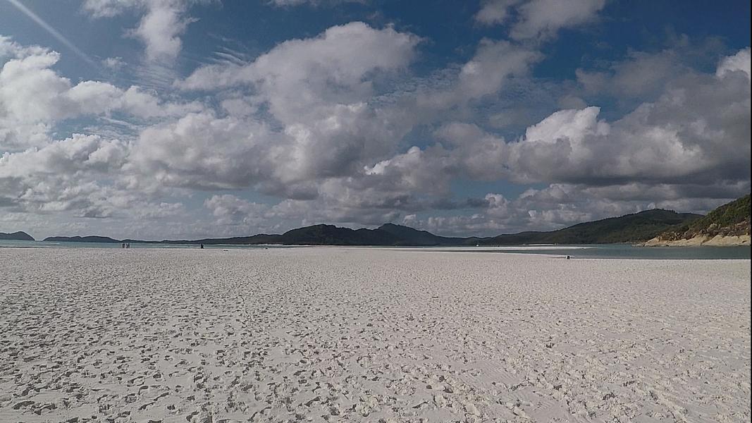 Zum Essen gab es Hünchen mit Kartoffelpüree, was für die sehr kleine Küche an Bord erstaunlich gut war. Abends spielten wir gemütlich Karten und tranken etwas Goon (sehr billiger Wein, den man in 4 oder 5 Liter Kanister kaufen kann). Da es am nächsten Morgen früh zum Whiteheaven-Beach ging, gingen wir relativ frueh schlafen. Dies hat sich aber auch gelohnt, da wir so die ersten an diesem schneeweißem Strand waren. Ganz so wie auf den Postkarten sah er nicht aus, da gerade nicht Ebbe war, aber trotzdem wunderschön.